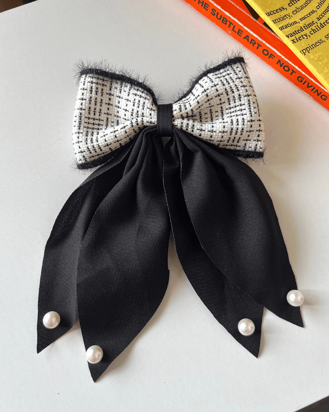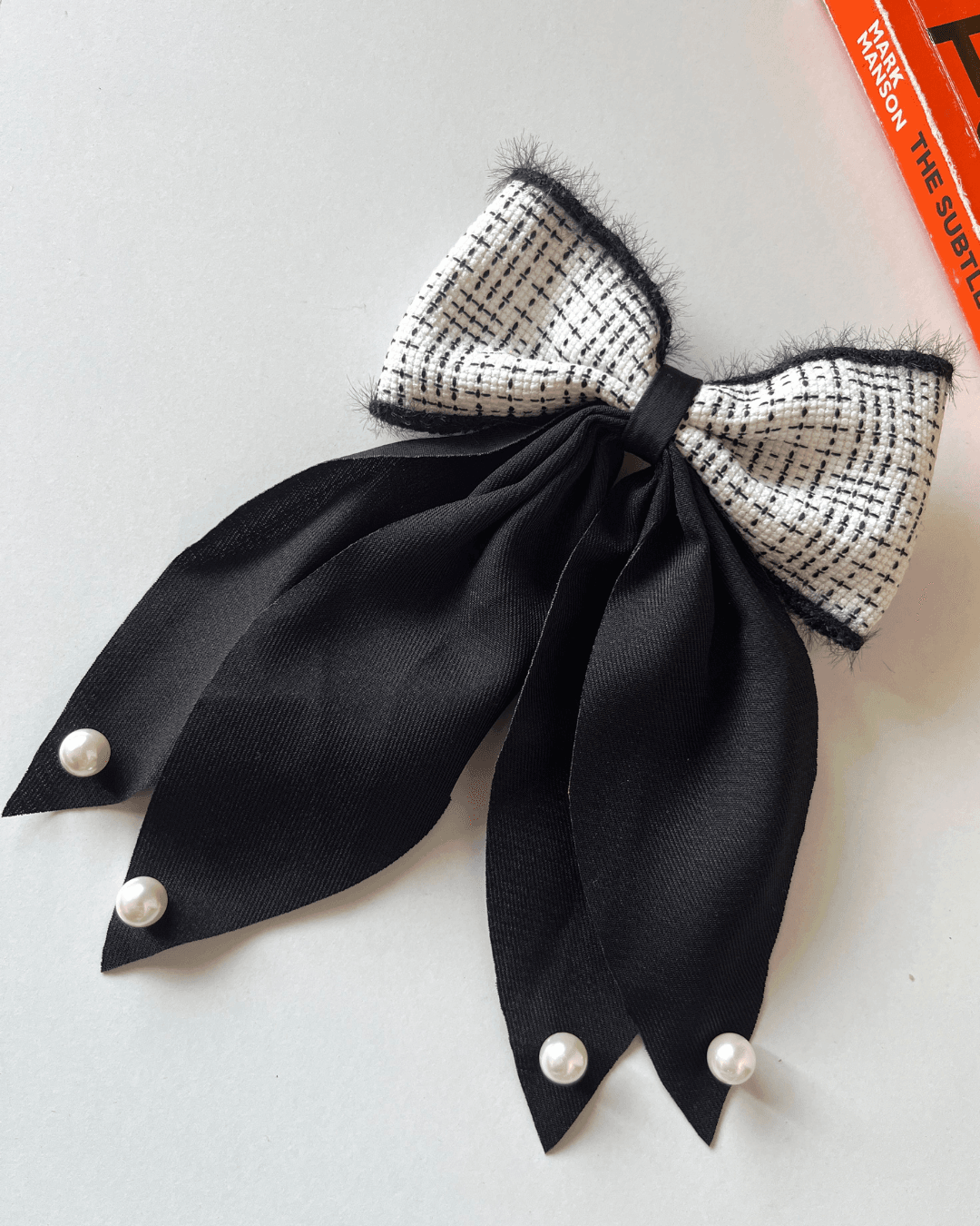black bow clip, monochrome hair bow, tweed hair accessory, Korean style bow, school bow clip, classy hair clip India