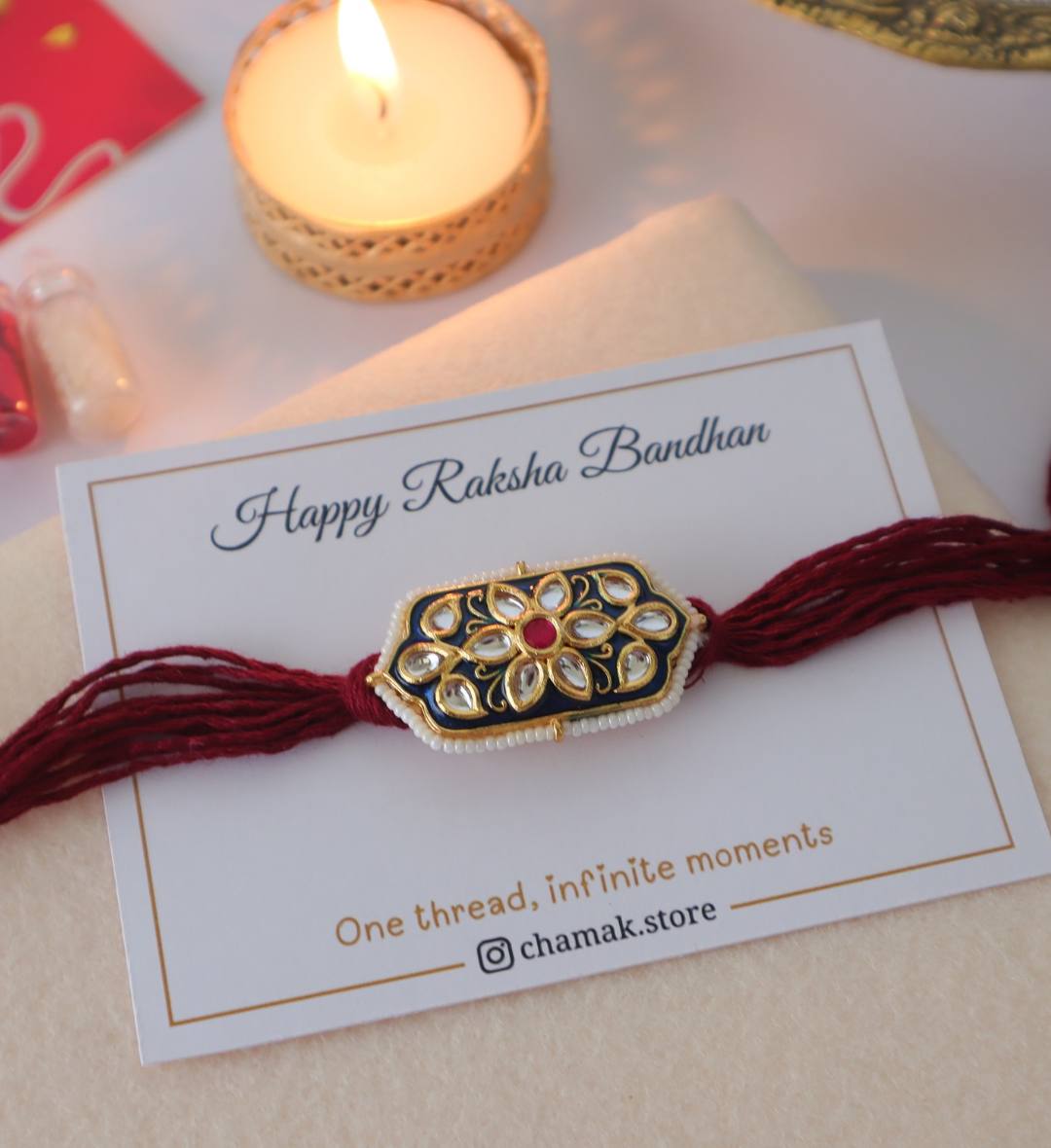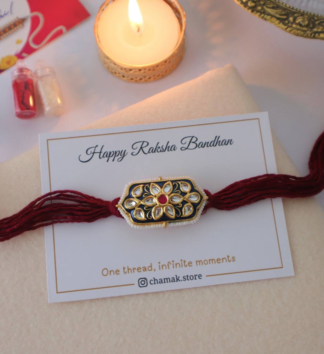 Celebrate Raksha Bandhan with a touch of royalty! This Kundan Meenakari Rakhi is a beautiful blend of traditional craftsmanship and elegant design. Featuring intricate meenakari work and embellished with sparkling kundan stones, this Rakhi adds a regal charm to the festive occasion. Handcrafted with care, it’s a perfect token of love for your beloved brother.