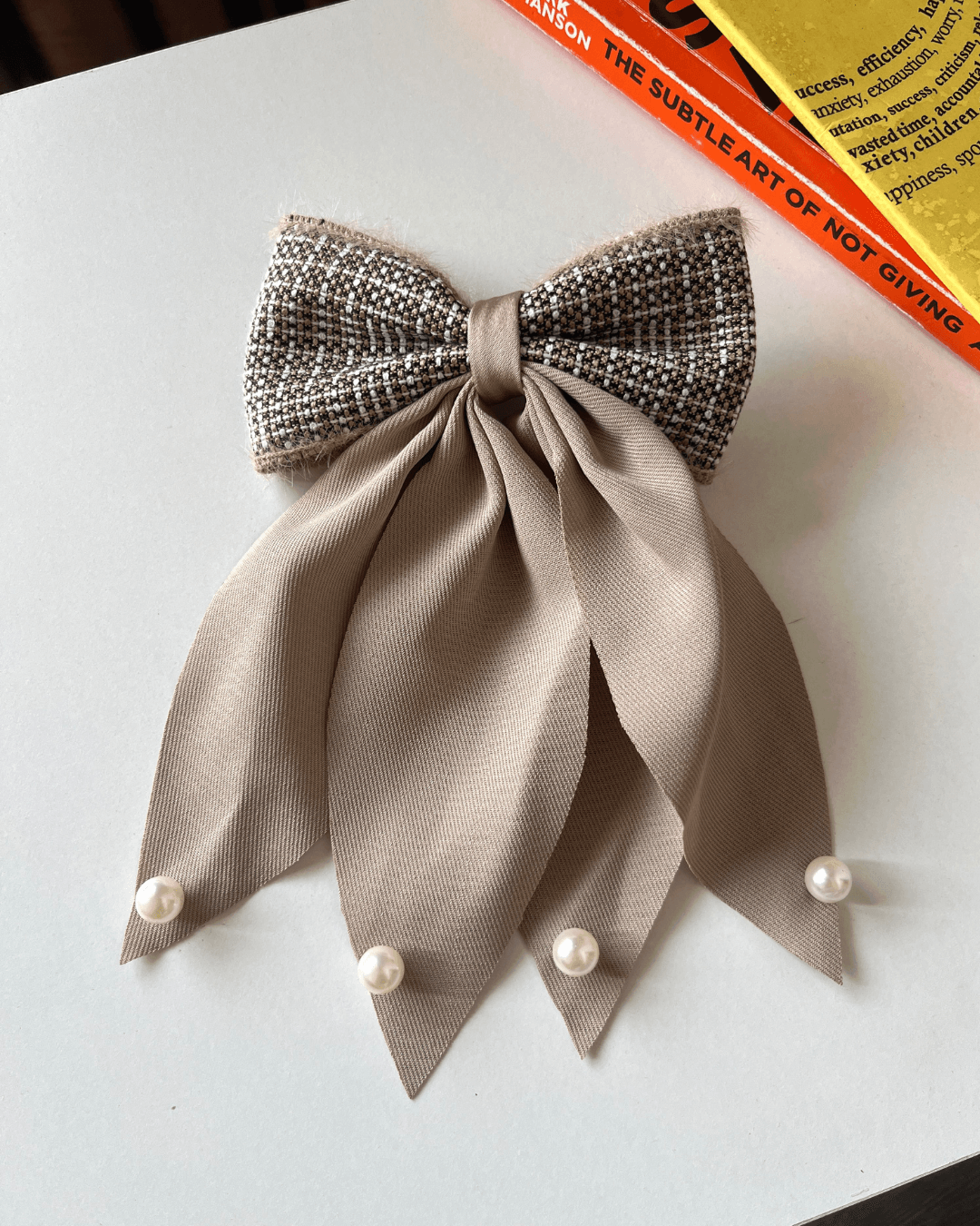 beige bow clip, nude hair bow, neutral bow accessory, tweed bow India, minimal hair bow, Korean bow style