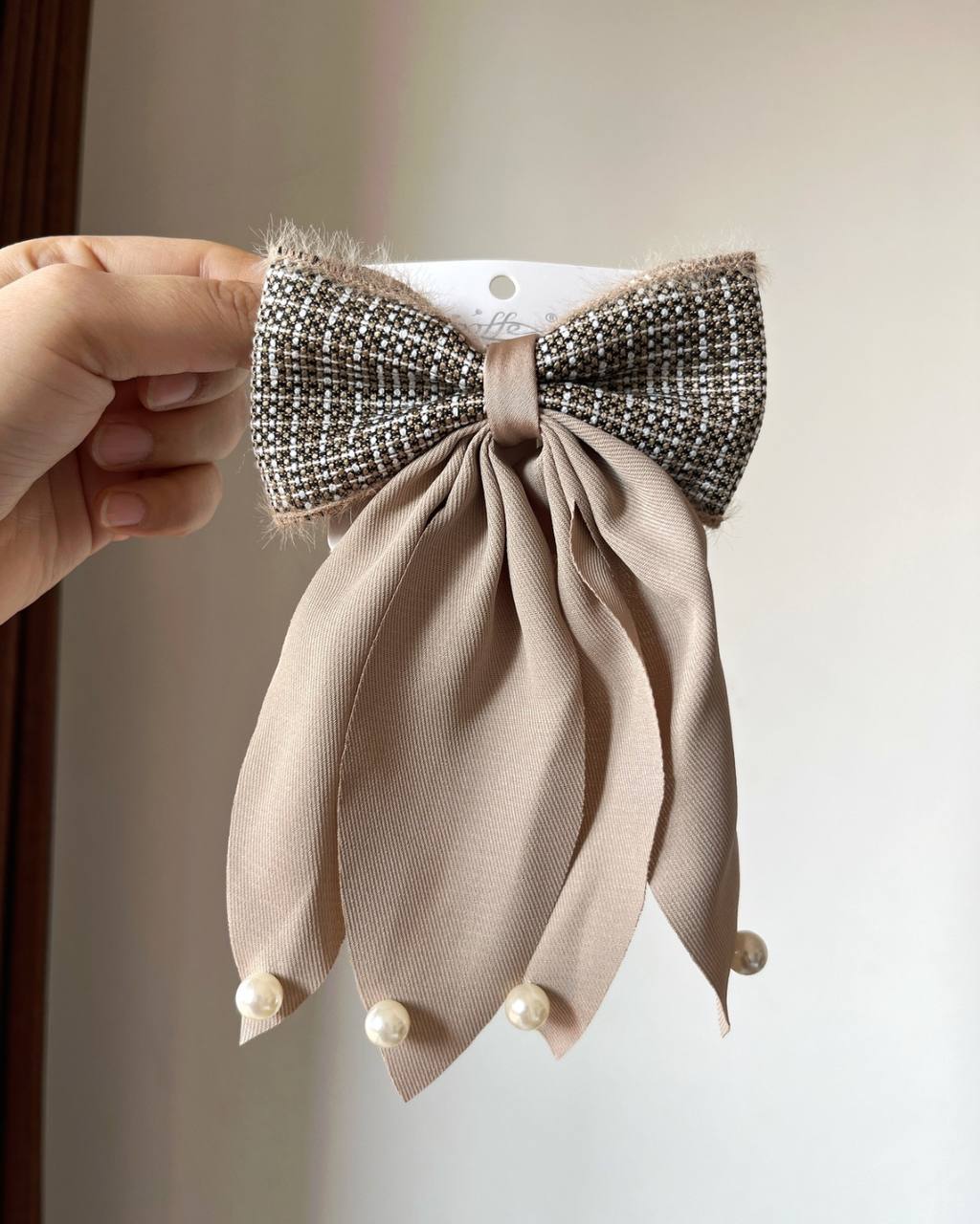 A subtle and minimal bow featuring a delicate beige tweed pattern paired with nude satin tails. Its soft neutral tones make it perfect for everyday wear and effortlessly match any outfit style.