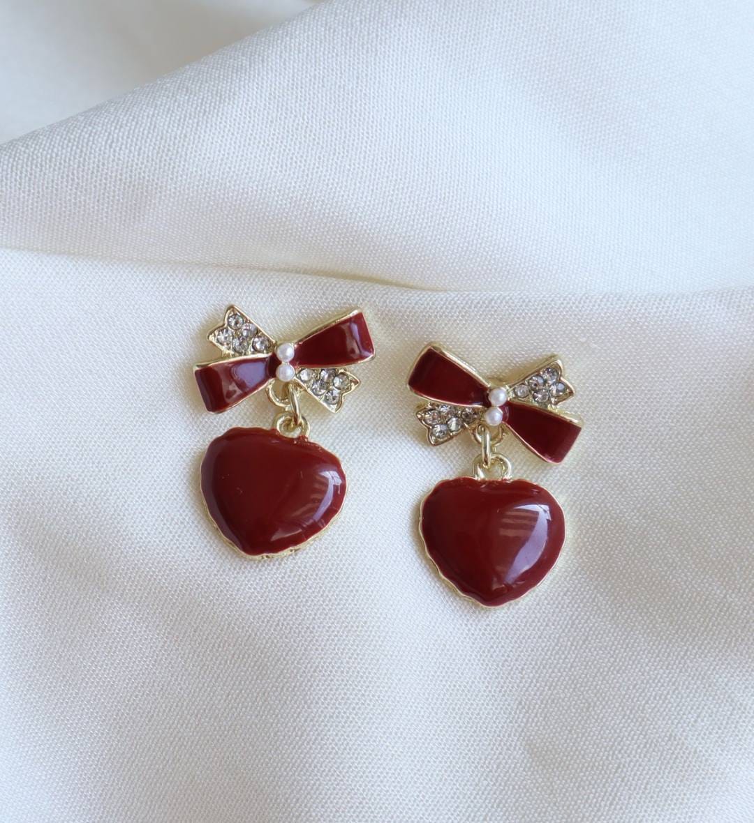 red heart earrings, cute bow earrings, romantic earrings, Korean style earrings, pearl bow earrings
