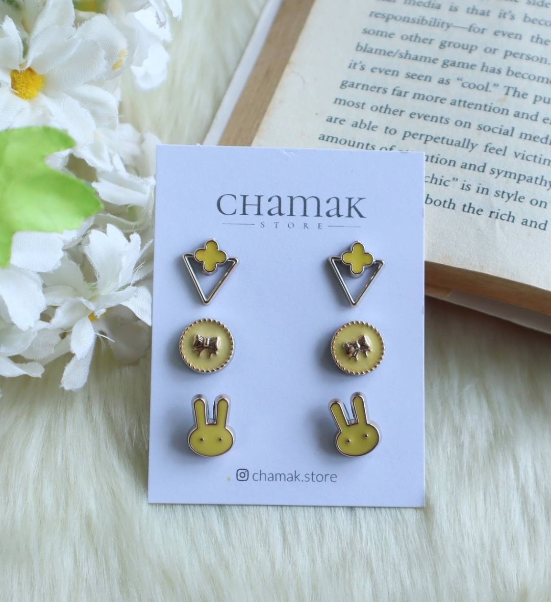yellow stud earrings set, cute enamel earrings, bunny earring set, bow stud earrings, triangle clover studs, fun earrings for girls, quirky minimal earrings, pastel yellow earrings, girls gift studs, 3 pair earring combo